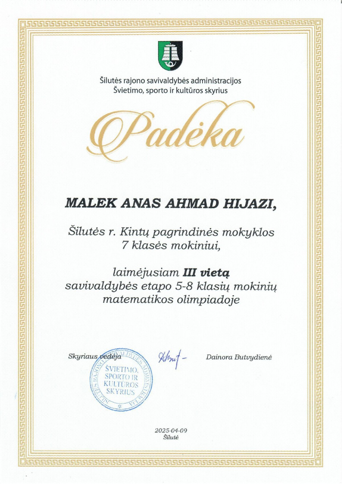 Malek Anas Ahmad Hijazi, 7 klasės mokinį, rajono 5-8 klasių mokinių matematikos olimpiadoje laimėjusį III vietą.