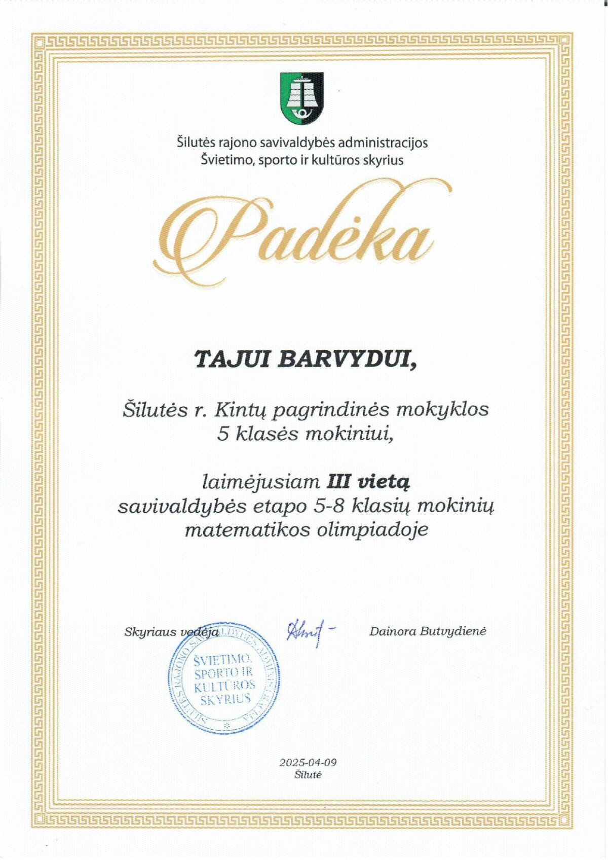 Tajų Barvydą, 5 klasės mokinį, rajono 5-8 klasių mokinių matematikos olimpiadoje laimėjusį III vietą,