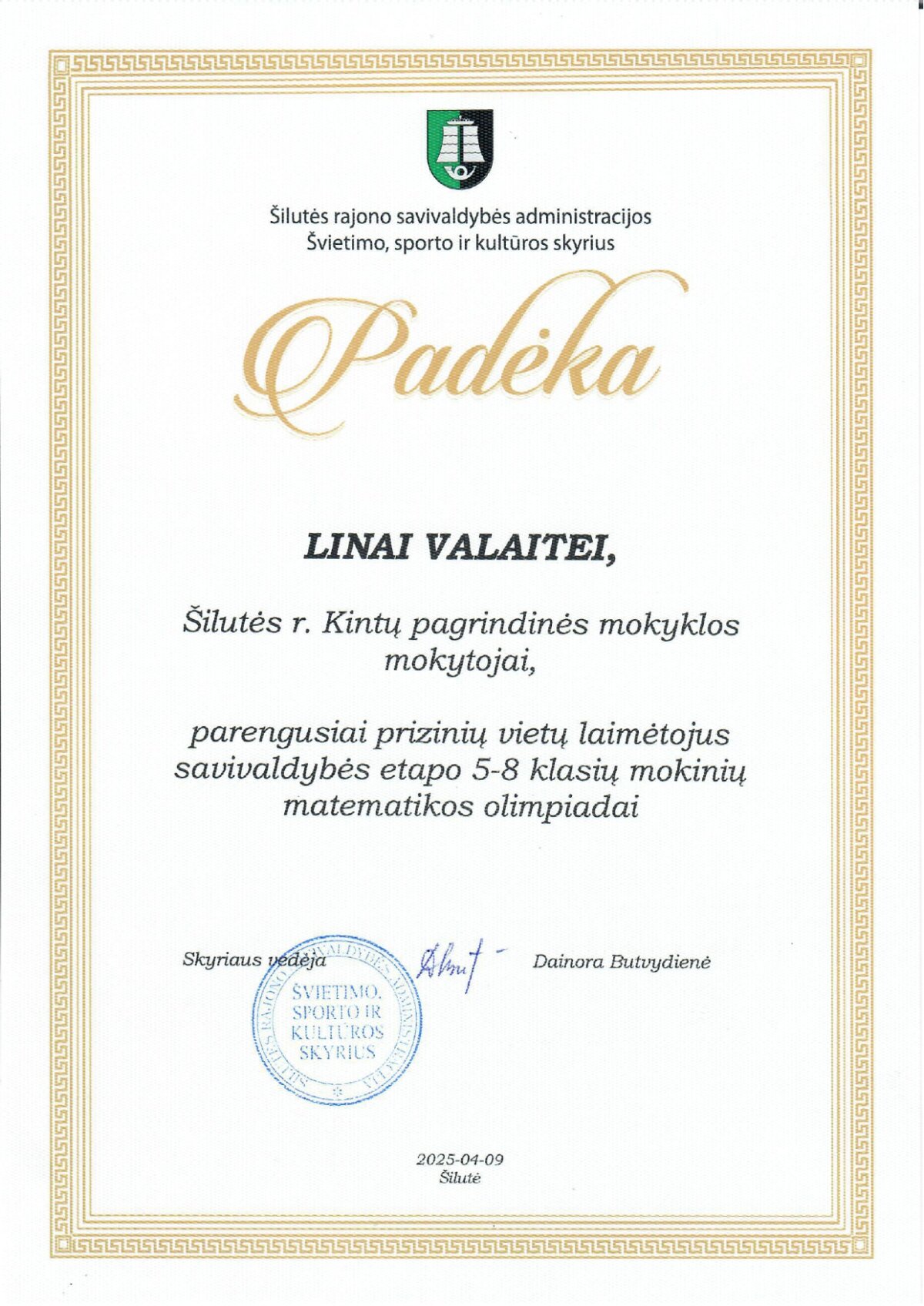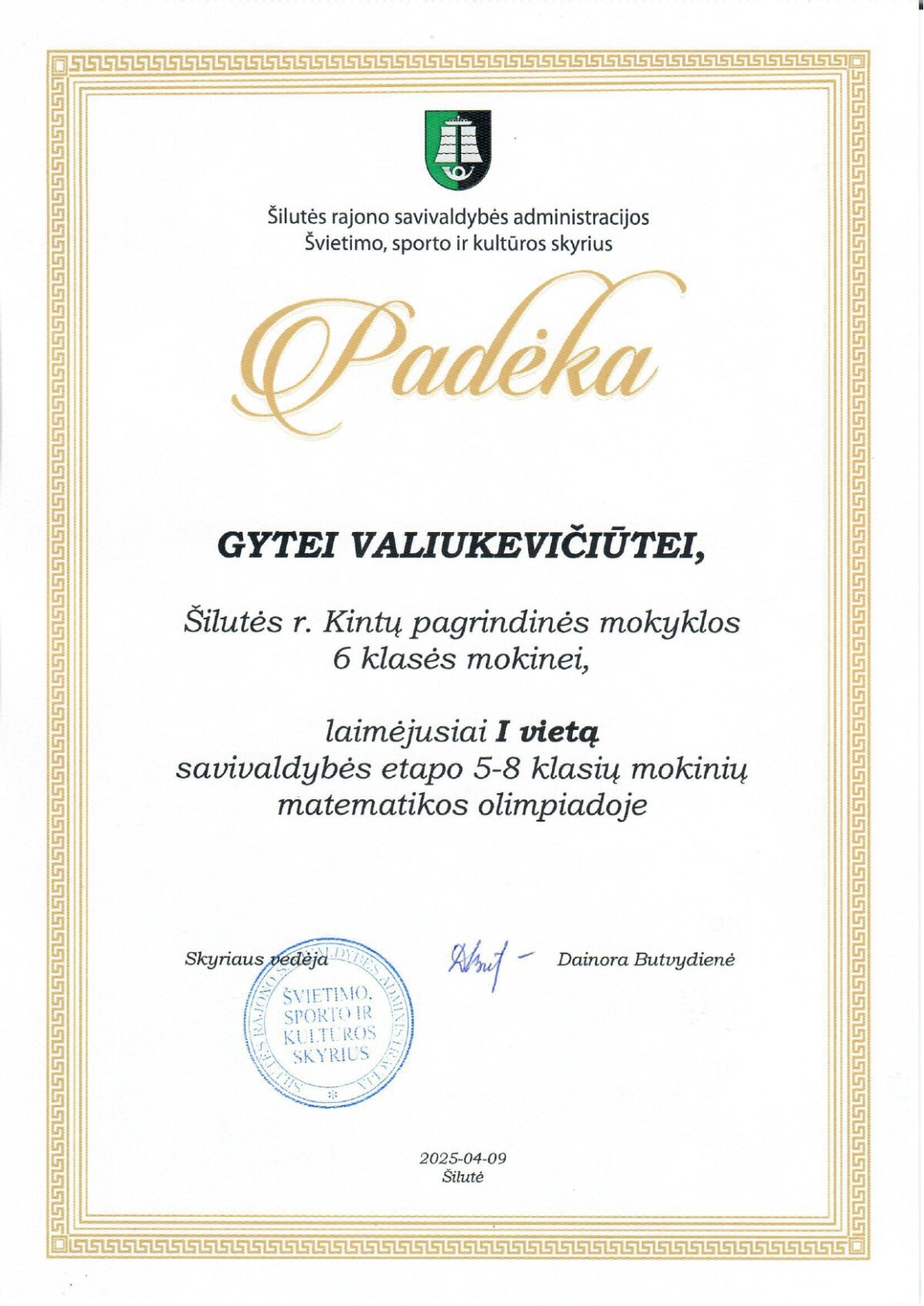 Gytę Valiukevičiūtę, 6 klasės mokinę, rajono 5-8 klasių mokinių matematikos olimpiadoje laimėjusią I vietą,
