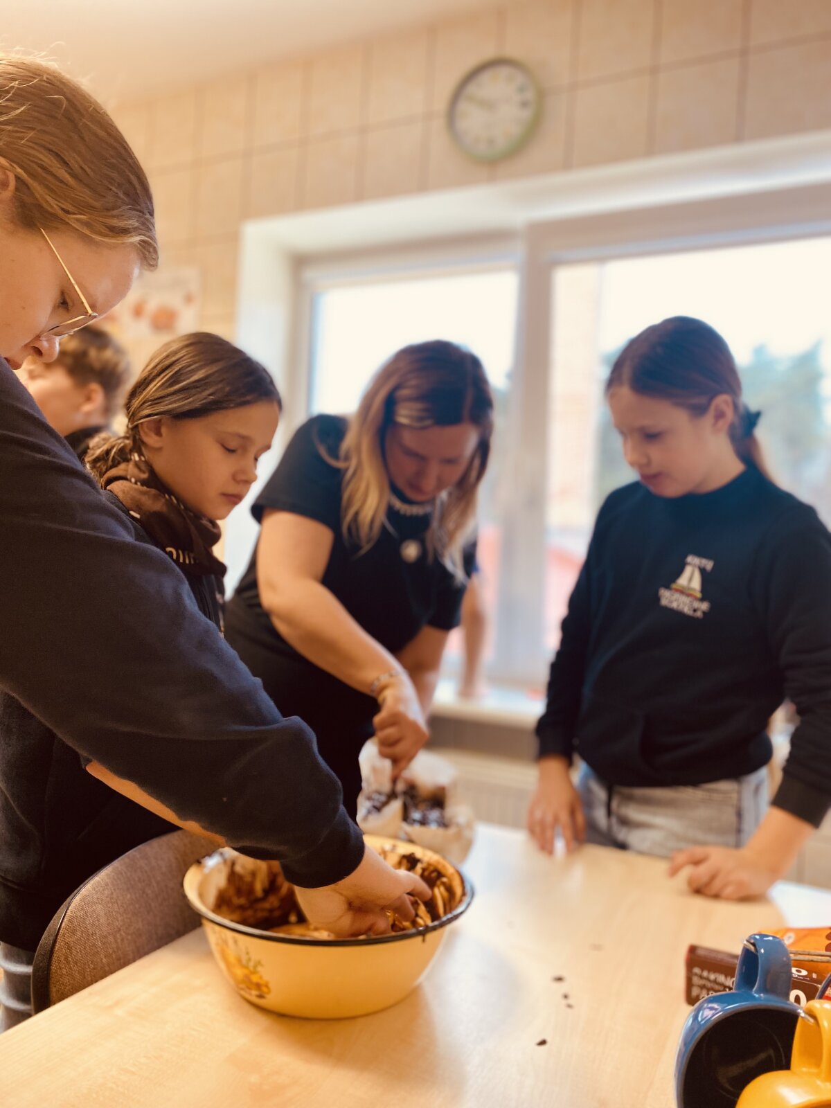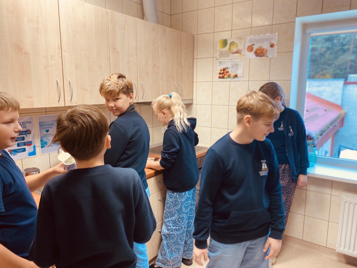 5 klasės mokiniai klasės valandėlės metu gamino ,,Obuolinį tinginį”, atliko skaičiavimus apie reikiamą produkto kiekį, ugdė darbo komandoje ir socialinius įgūdžius.