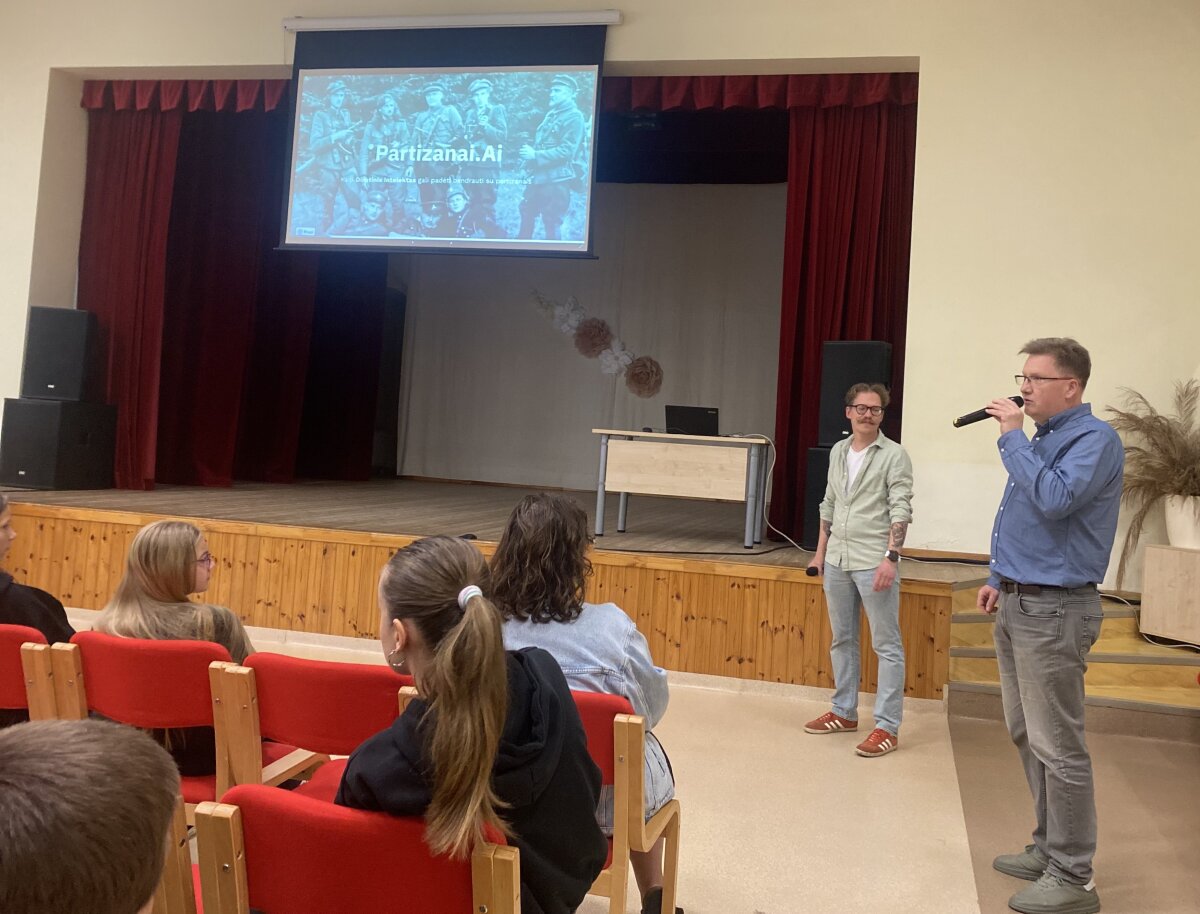 Pamokos svečias – Eimantas Stonys – pristatė savo sukurtą internetinę platformą Partizanai.ai, veikiančią dirbtinio intelekto pagrindu. Jis papasakojo, kaip gimė šios idėjos sumanymas, su kokiais iššūkiais susidūrė kūrimo procese, bei kaip DI gali padėti istoriją pažinti kitaip – gyviau, interaktyviau ir įdomiau.
