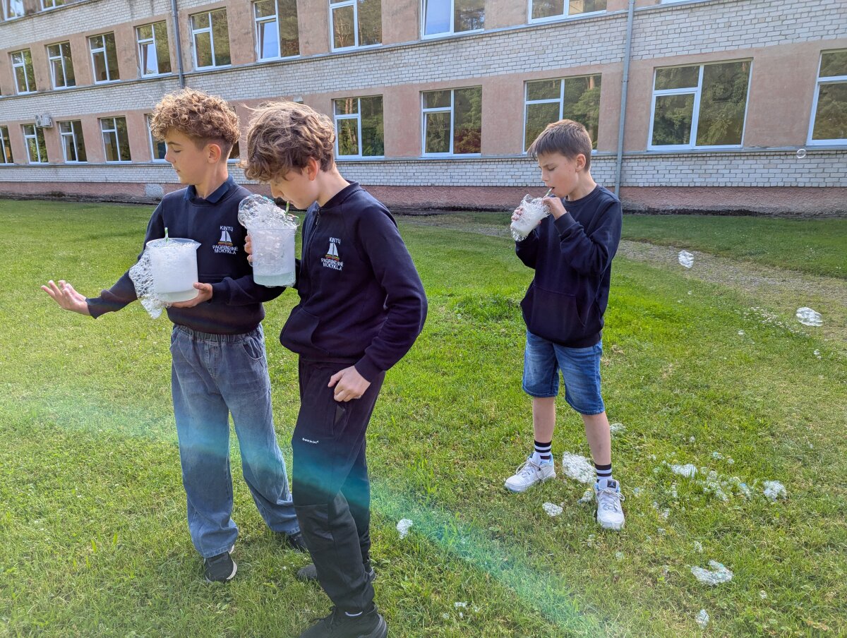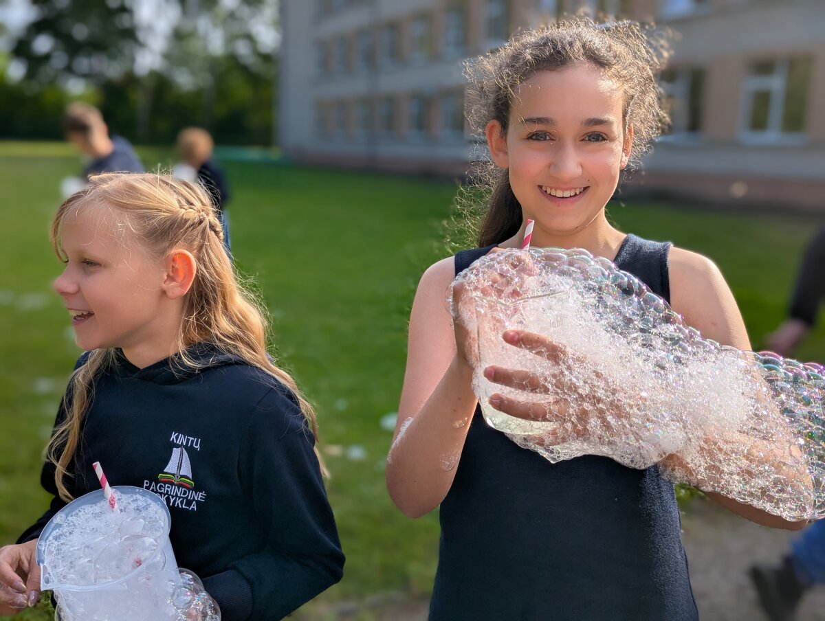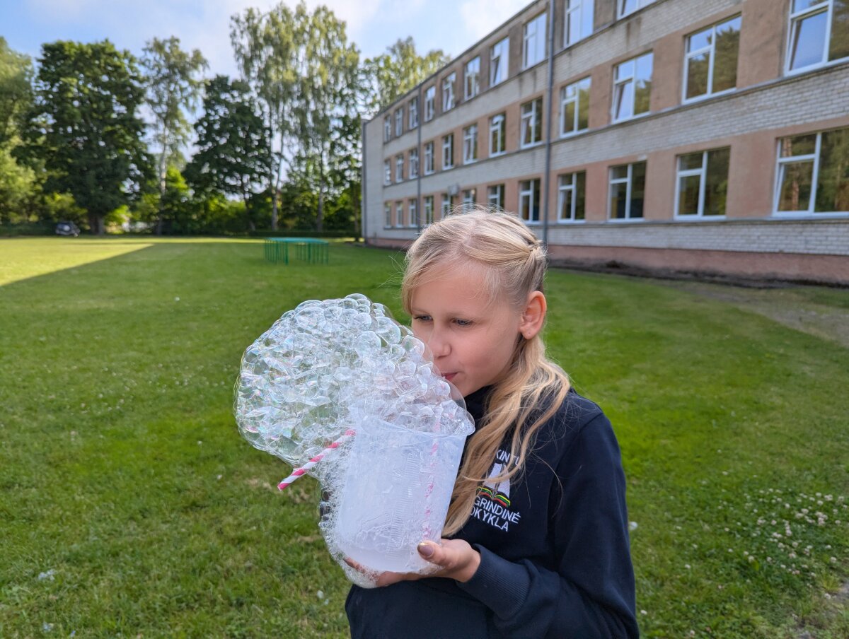 Birželio 17 d. 5 klasės mokiniai dalyvavo praktinėje veikloje – gamino muilo burbulų tirpalus klasėje, o vėliau bandė juos lauke prie mokyklos.