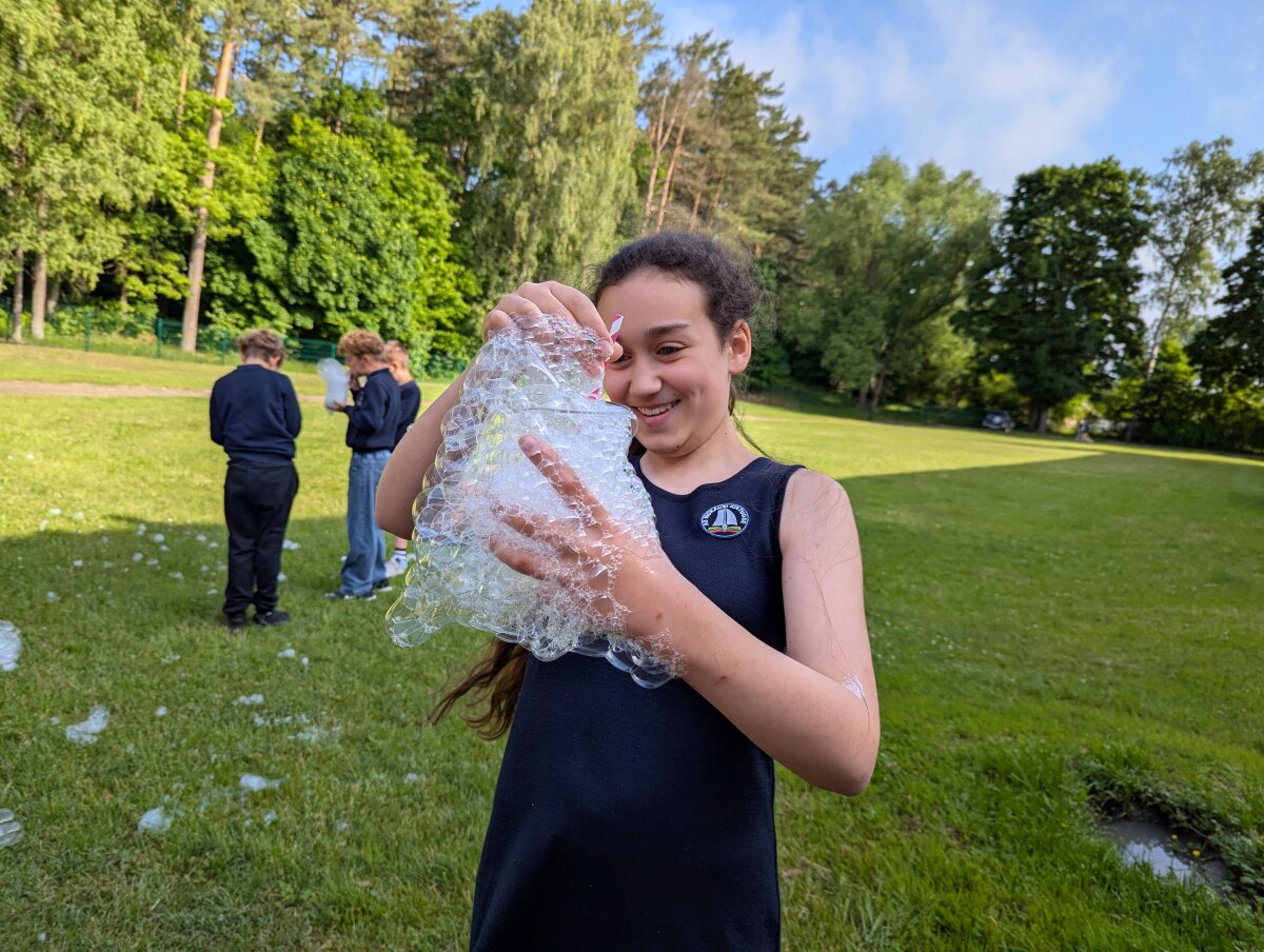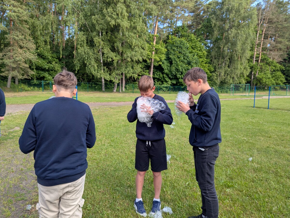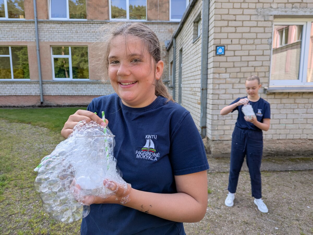 Birželio 17 d. 5 klasės mokiniai dalyvavo praktinėje veikloje – gamino muilo burbulų tirpalus klasėje, o vėliau bandė juos lauke prie mokyklos.