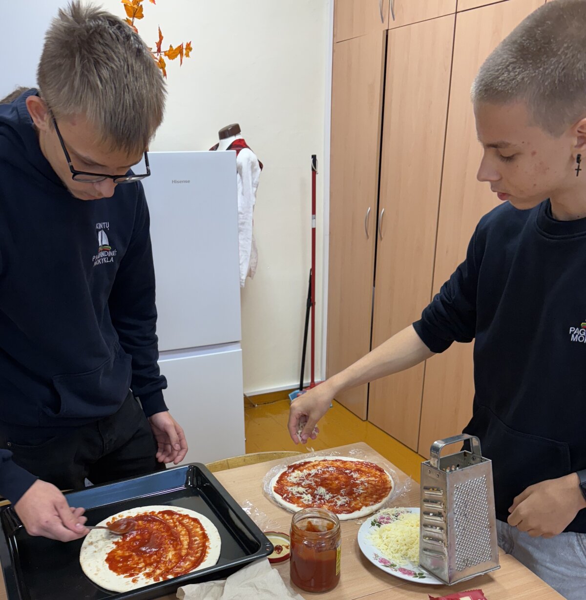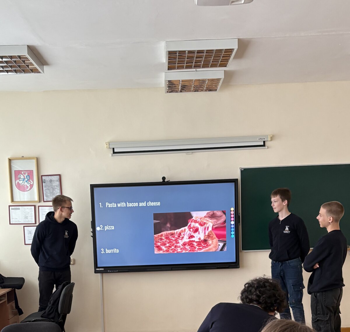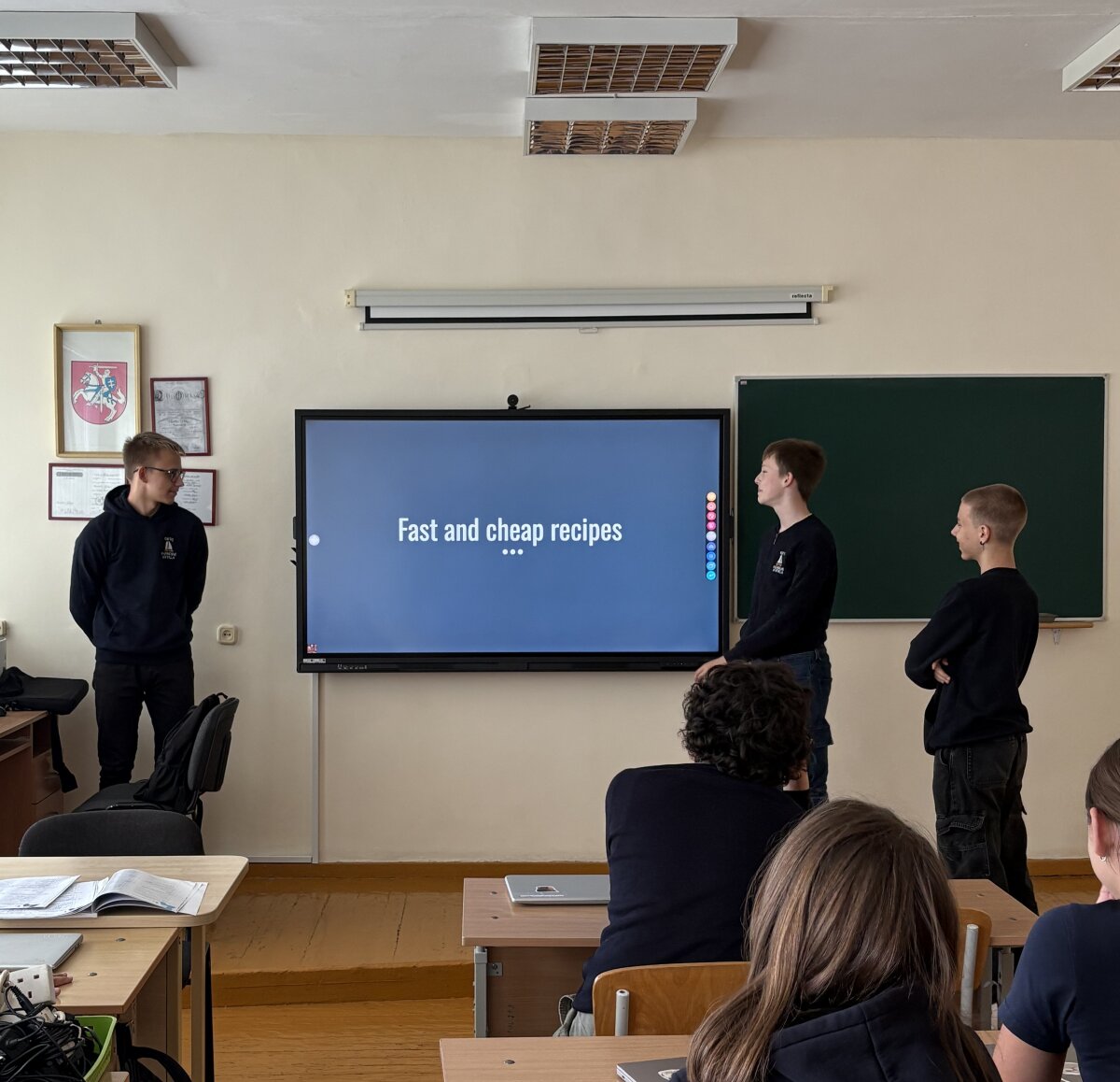 8 klasės mokiniams spalio 12-16 d. vyko netradicinės anglų kalbos pamokos. Mokiniams pasiskirsčius grupėmis buvo pateikta užduotis, anglų kalba parašyti tris paprastus ir pigius receptus, tuomet juos pristatyti prieš klasę. Po pristatymų grupės turėjo išsirinkti vieną receptą, kurį jie gamins.