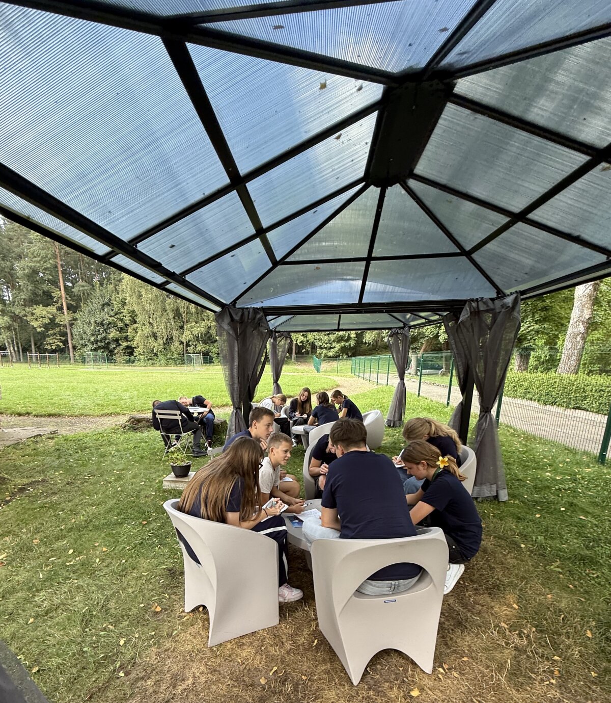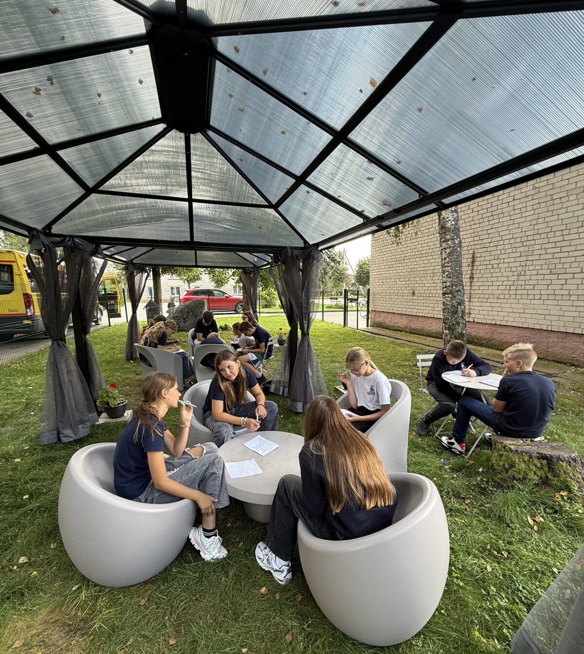 Rugsėjo ir spalio mėnesį, kol dar lepino orai, lietuvių kalbos pamokas leisdavome mokyklos teritorijoje įrengtose lauko pavėsinese.